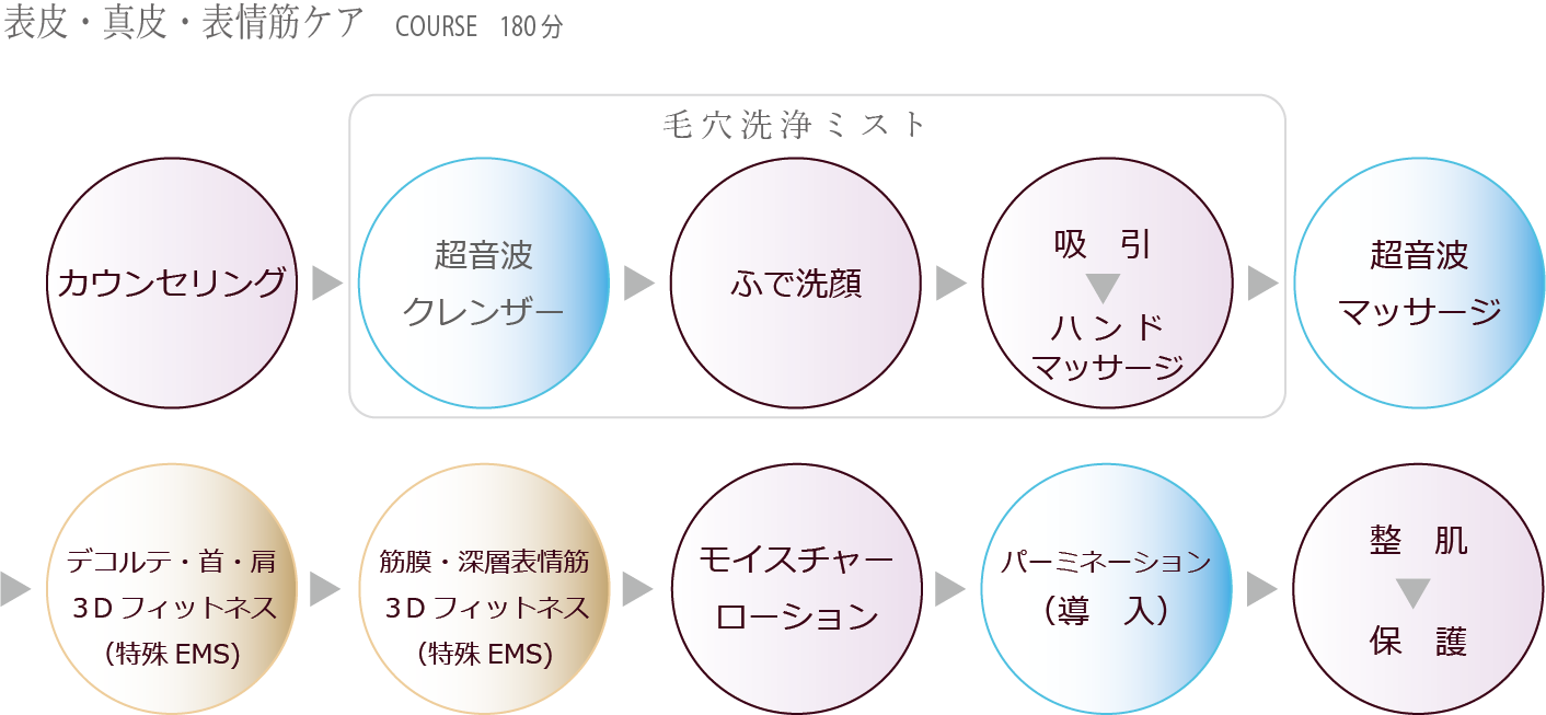 お肌の層(表皮・真皮・皮下組織・表情筋)にアプローチする、充実のフェイシャルコース